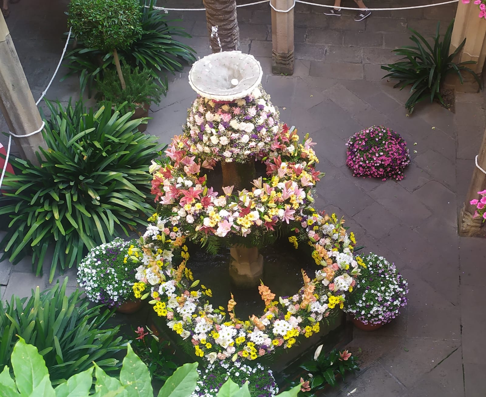 Фонтаны украшают композициями из живых цветов. Никто точно не знает, когда и как зародилась эта традиция, но она является частью праздника Тела Христова в Барселоне с 1637 года.